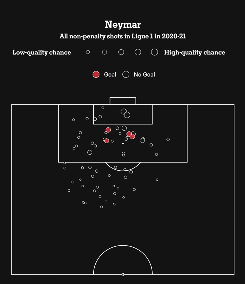 এর আগে বার্সেলোনায় যখন খেলেছেন, নেইমার তখন আক্রমণভাগের বাকি দুজন সতীর্থ, অর্থাৎ মেসি আর সুয়ারেজের সঙ্গে আক্রমণের দায়িত্বটা ভাগাভাগি করেছেন। যেটা আমরা দেখতে পাই তাঁর শট ম্যাপে, মাঠের বাঁ-প্রান্ত থেকেই তিনি শট নিতেন বেশির ভাগ সময়।